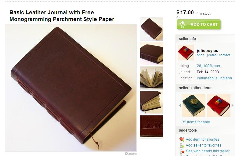 Journal, LinksHandmade Journals by Julie Boyles September 18, 2008 Nifty Notebook Leave a comment Available on Etsy, some lovely leather-bound journals. Some are quite embellished, but I like the look of the plain brown leather ones the best. And at $17, these seem very reasonably priced. You can even get free monogramming!