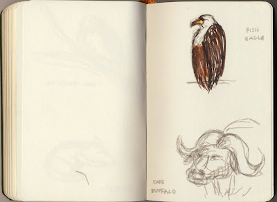Here are some animal sketches from the recent safari trip. A pocket size notebook is a great thing to bring on safari, especially if, like me, you’re not a photography nut. I brought a tiny digital camera (a Casio Exilim, which also happens to be my favorite golden rectangle-ish shape, though much smaller than 3×5) and I did take hundreds of photos, but I found that trying to capture things in drawings was more fun. You don’t have a lot of time, as the animals are moving and the safari vehicle is moving and your fellow travelers are jostling around trying to get their photos. But in the end, I filled a sketchbook with drawings that became a very personal memento of the trip.