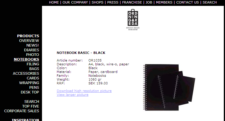 No link to the other available sizes, and no actual measurements for those of us in countries where the term “A4” tends not to be used. (See here for a chart of paper sizes.) There’s not much other info: it doesn’t even tell you whether the paper is lined or not. There’s something else called “Notebook Basic– Black” further down the page, but it’s a different kind of notebook, not spiral bound, and again seems to only offer one size rather than the two pictured.