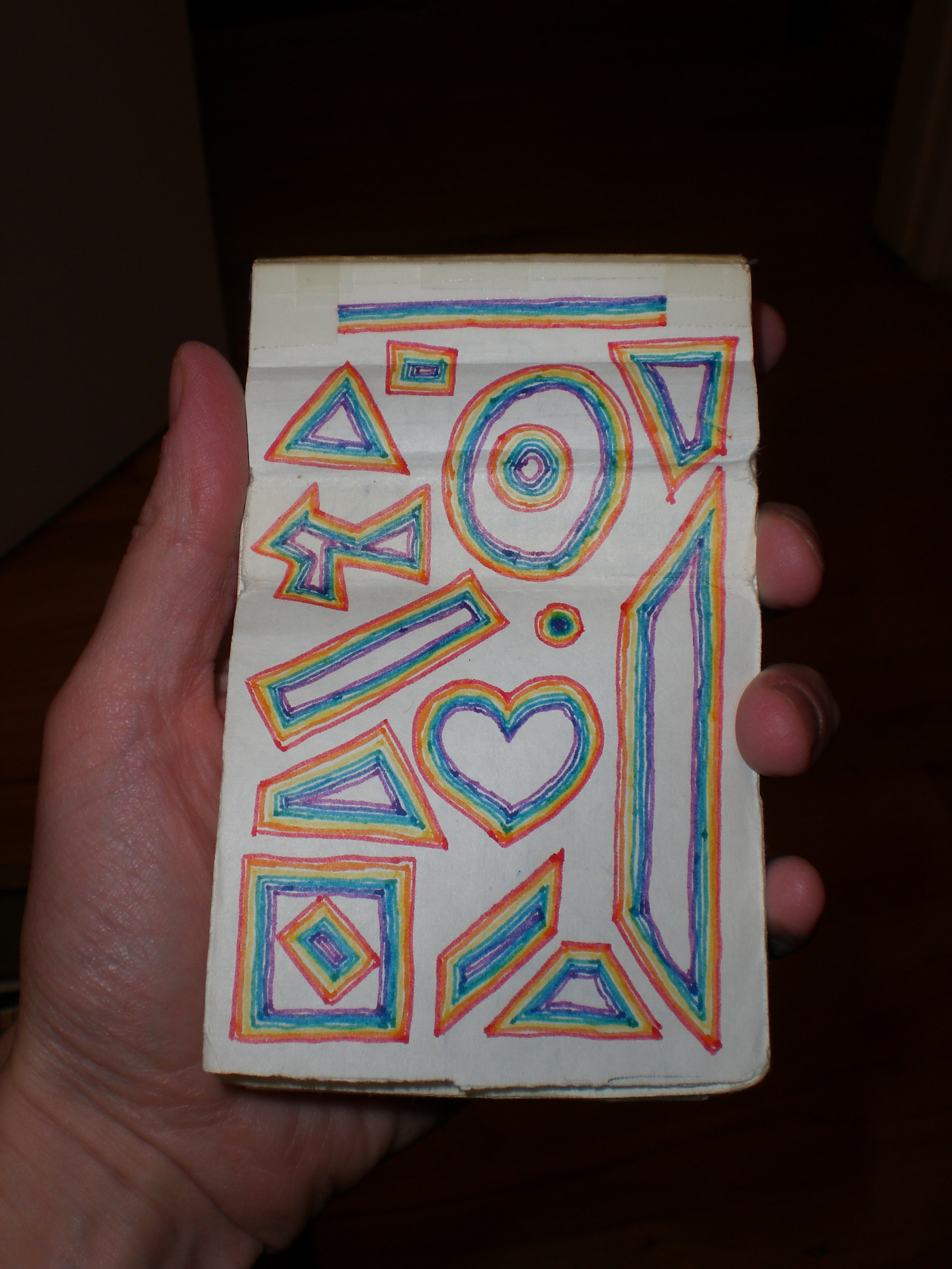 This started out as a simple plain notepad, the kind with glued-together pages and a cardboard backing. They came as a pack of 3 that were meant to be separated, but I liked the chunky thickness so I left them all together. I decorated the first page with some snazzy rainbow designs and decided to keep it as a cover, folding it back when I wanted to access further pages.