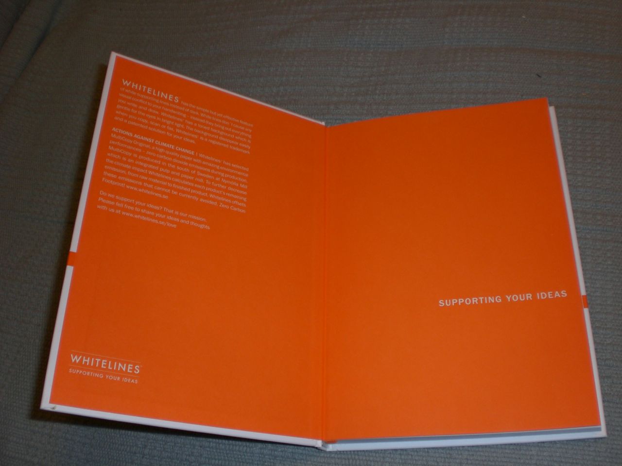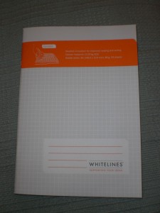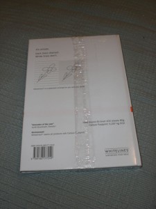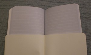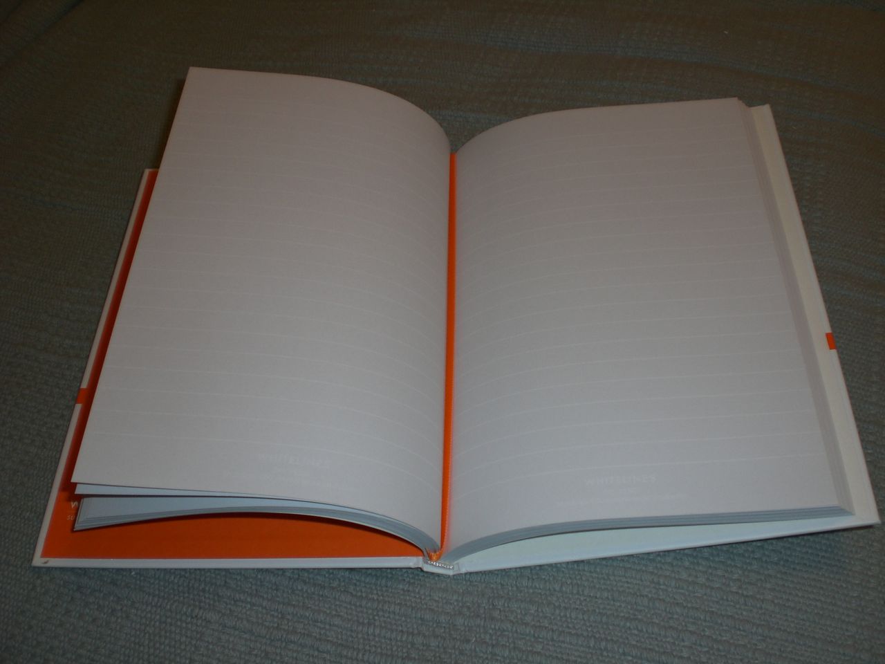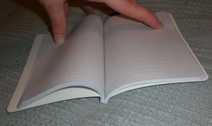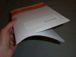 This notebook is very similar to a Moleskine Volant– it’s the same thickness and width, but the Whitelines notebook is slightly taller. The cover and binding are rather stiff– it doesn’t open as flat as a Volant, and the cover is creased a little way in from the spine. Once you’ve opened it, it won’t close flat, more so than the Volant.