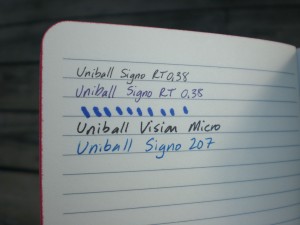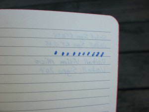 The paper is a little rougher than a Moleskine– it still worked well with most of my rollerball pens, and show-through wasn’t too bad. (Those dots are the Super Sharpie.)