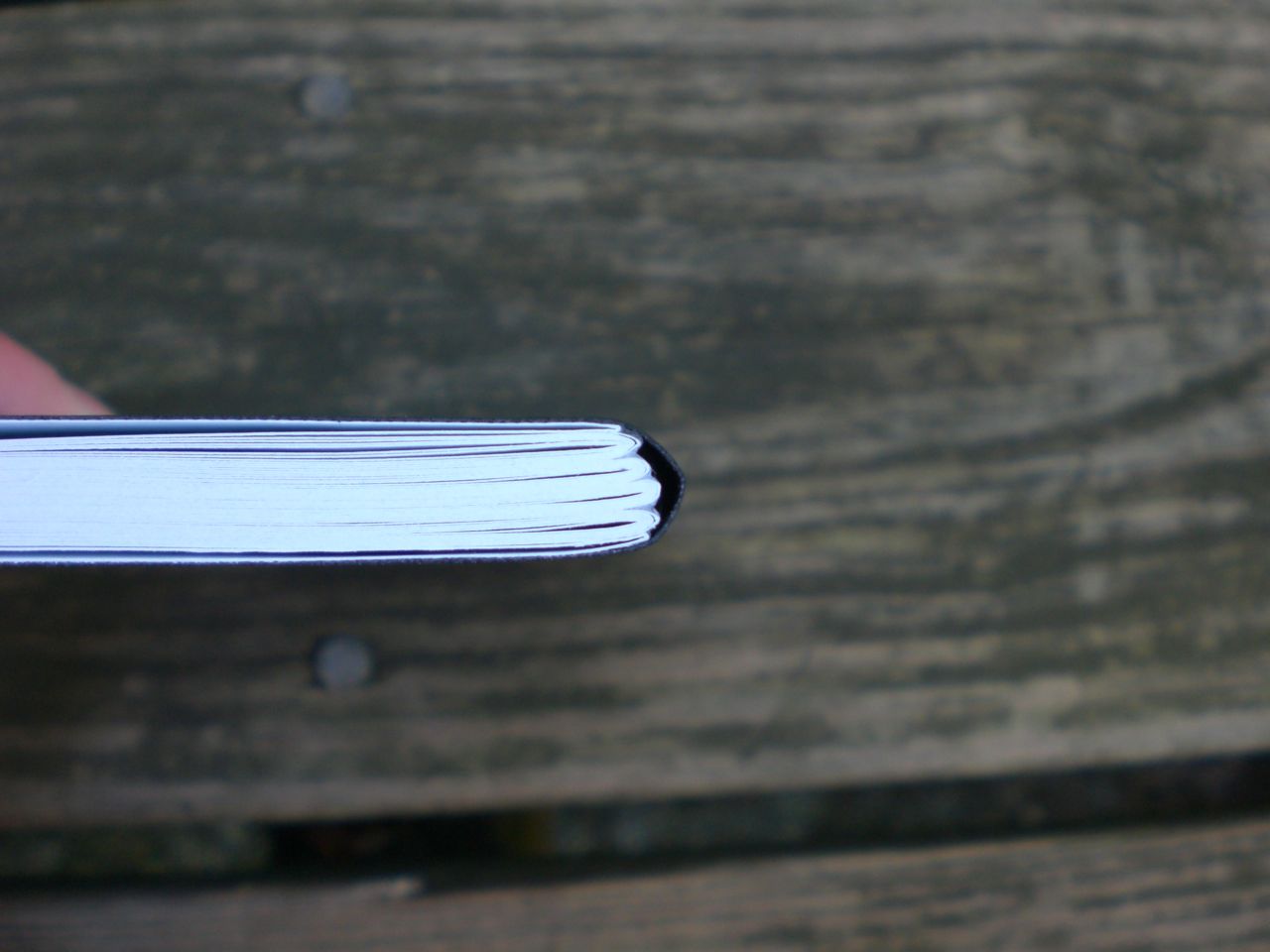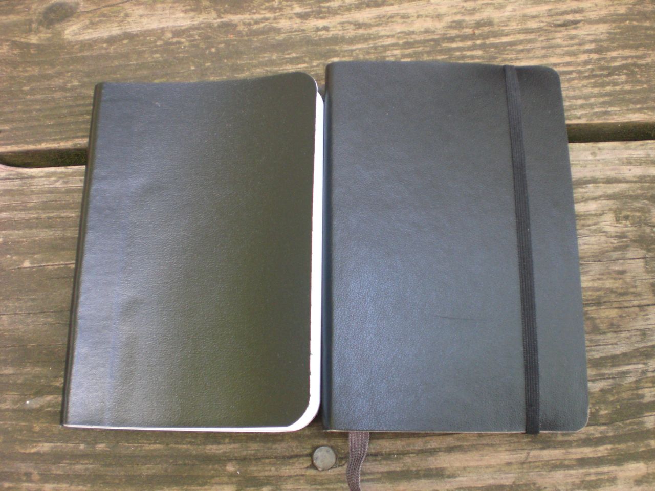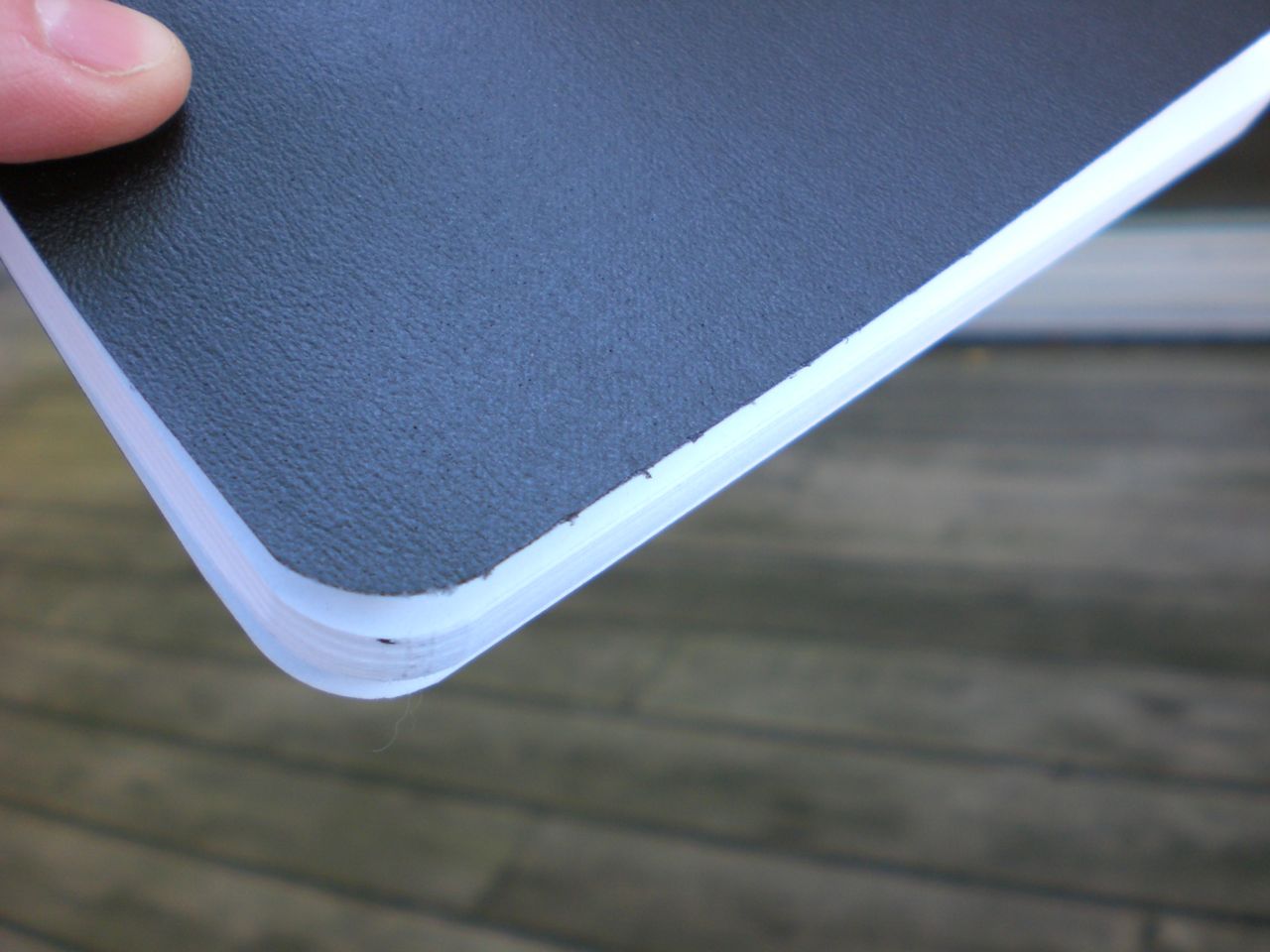 The Book Factory notebooks are very basic: no logo stamped anywhere, no elastic to hold them shut, no ribbon marker or pocket in the back. They aren’t made to the most exacting quality standards– the spines are slightly rounded, and the edges can have slight imperfections– they are just a faux-leather/oilcloth material adhered to a paper backing, like the softcover Moleskine, but the Moleskine seems to be trimmed a bit more sharply. I worried that the slightly loose threads at the edge could start to unravel further with more use.