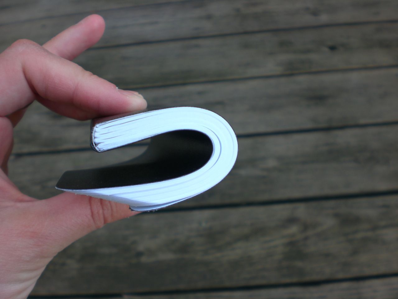 These notebooks are very flexible– you can almost roll them into a tube without harming them. They’ll stay bent for a while afterwards, but if you bend them back in the opposite direction, they’ll flatten out again. They also open perfectly flat.
