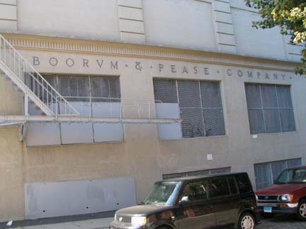Boorum & Pease manufactured and marketed office supplies, record-keeping supplies, and information storage and retrieval products, and was a leading manufacturer of blank books and loose-leaf binders. The company had an office and factory for many years in Vinegar Hill at Hudson Avenue and Front Street, and many Vinegar Hillers found employment here over the years. B&P, which had moved to Elizabeth, NJ, was acquired by Esselte Pendaflex in 1985.