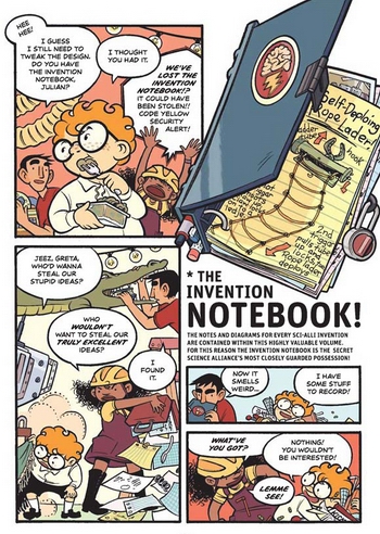 It’s from a review of a book called The Secret Science Alliance and the Copycat Crook.. The notebook itself is a pretty cool concept, with space to tuck pencils in the spine and that awesome brain-lightning logo! And the book sounds like a fun pick for your favorite science-nerd/ notebook-nerd kid!