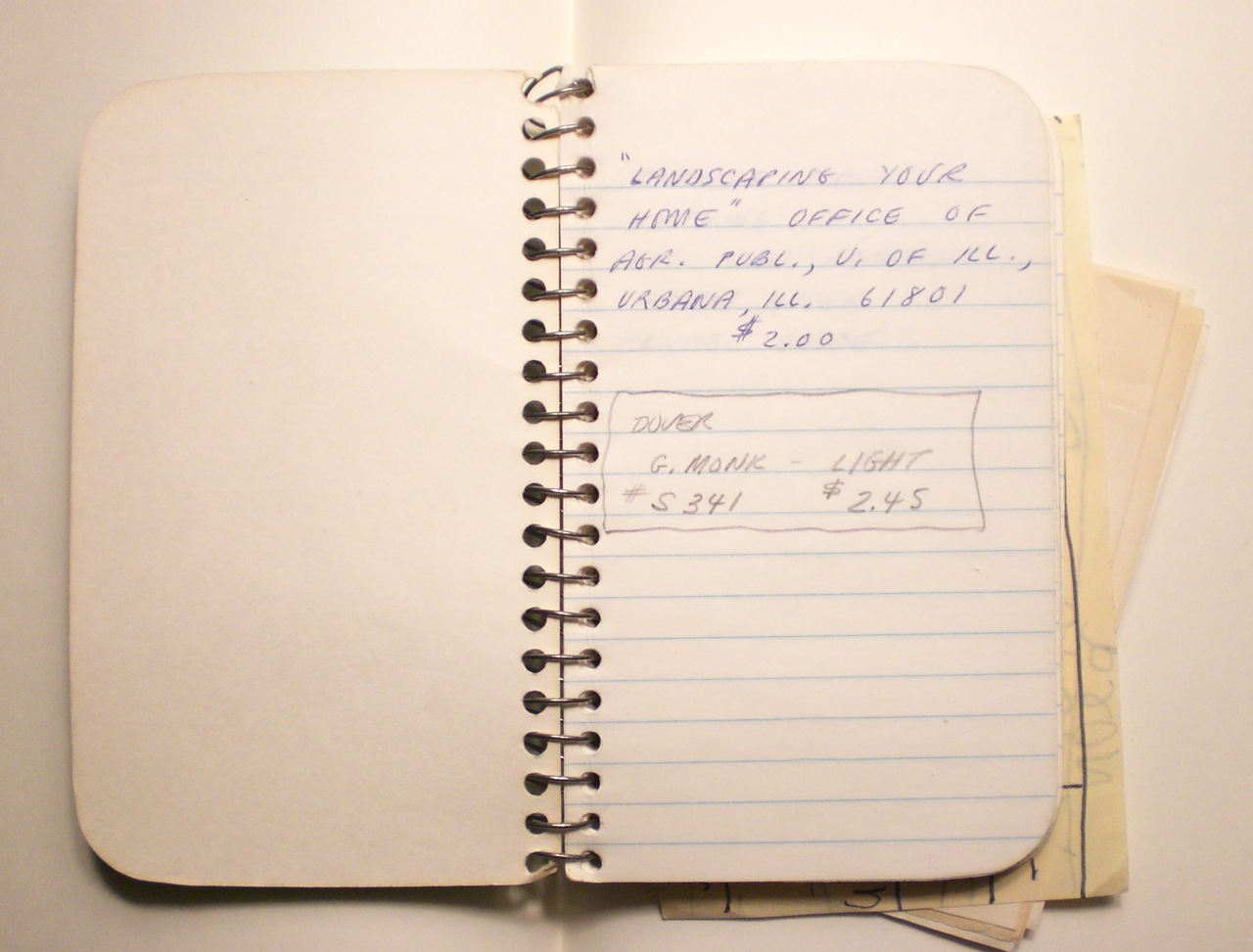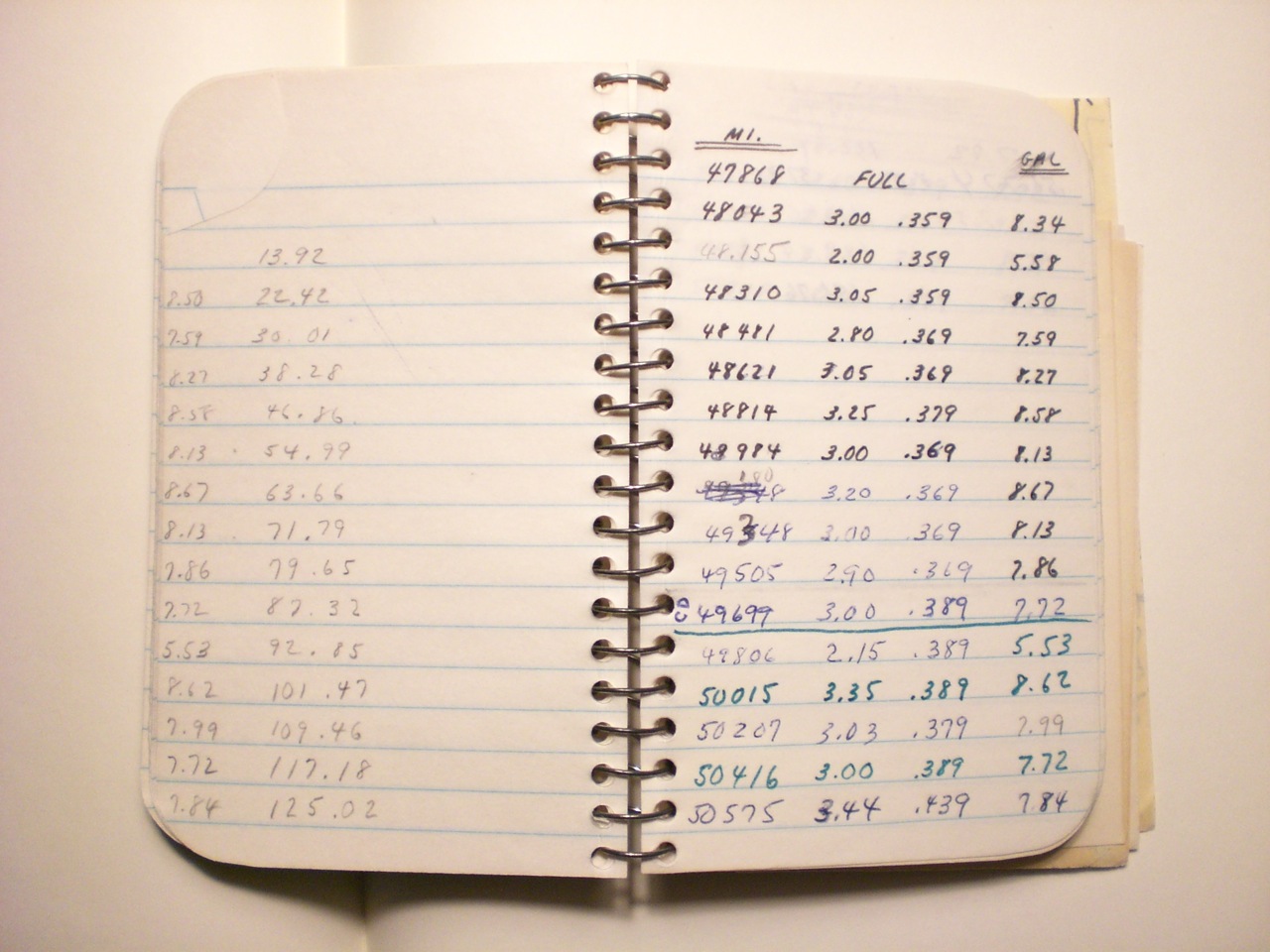 What’s most fascinating to me about the notebook is the window it provides into my father’s mind. He was always compiling lists of numbers– data on various things such as the economy, household projects, etc.– and jotting down books and music that he wanted to buy. This notebook was no exception. The page below was gas mileage tracking:
