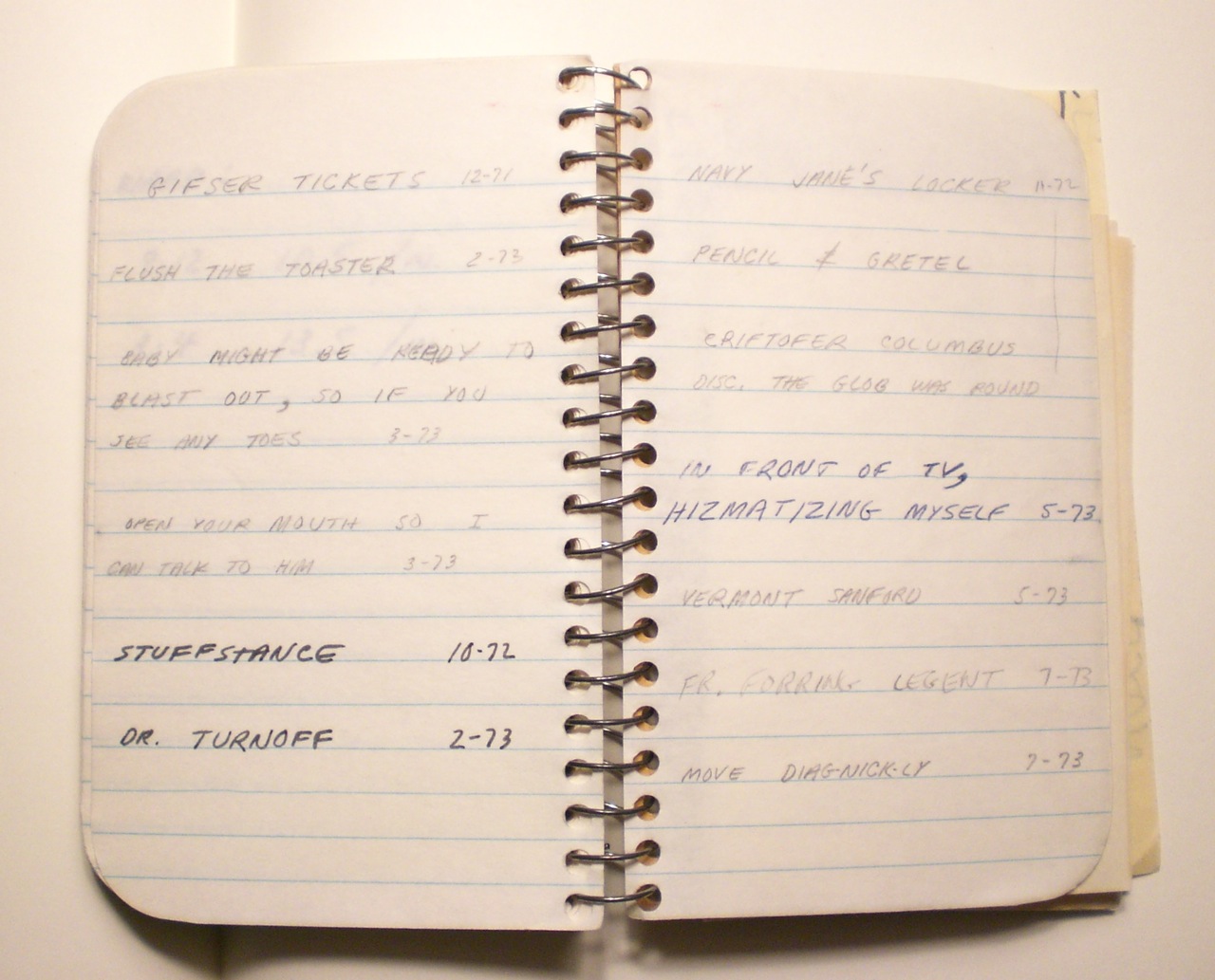 This notebook has a lot of sentimental value for me, as it belonged to my father. I remember seeing it in his desk when I was a kid and wishing he’d give it to me– my notebook lust started at a very young age. But I wasn’t supposed to be poking around in Dad’s desk, and I never saw him actually writing in this notebook– so to ask him for it would reveal that I’d been doing something naughty! But when I was going through all Dad’s papers after his death last year, I found it again, still in the same drawer where I’d remembered finding it 30 years earlier.