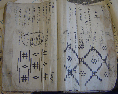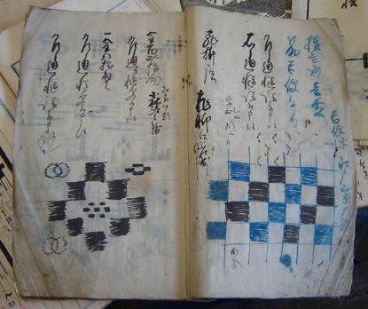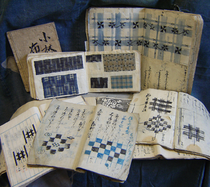 This set of eight books is a treasure. The books are the journals of a kasuri weaver/dyer from Omi, an area of Japan (present-day Shiga Prefecture) which produced some of Japan’s finest hemp and ramie kasuri textiles, known as Omi jofu.