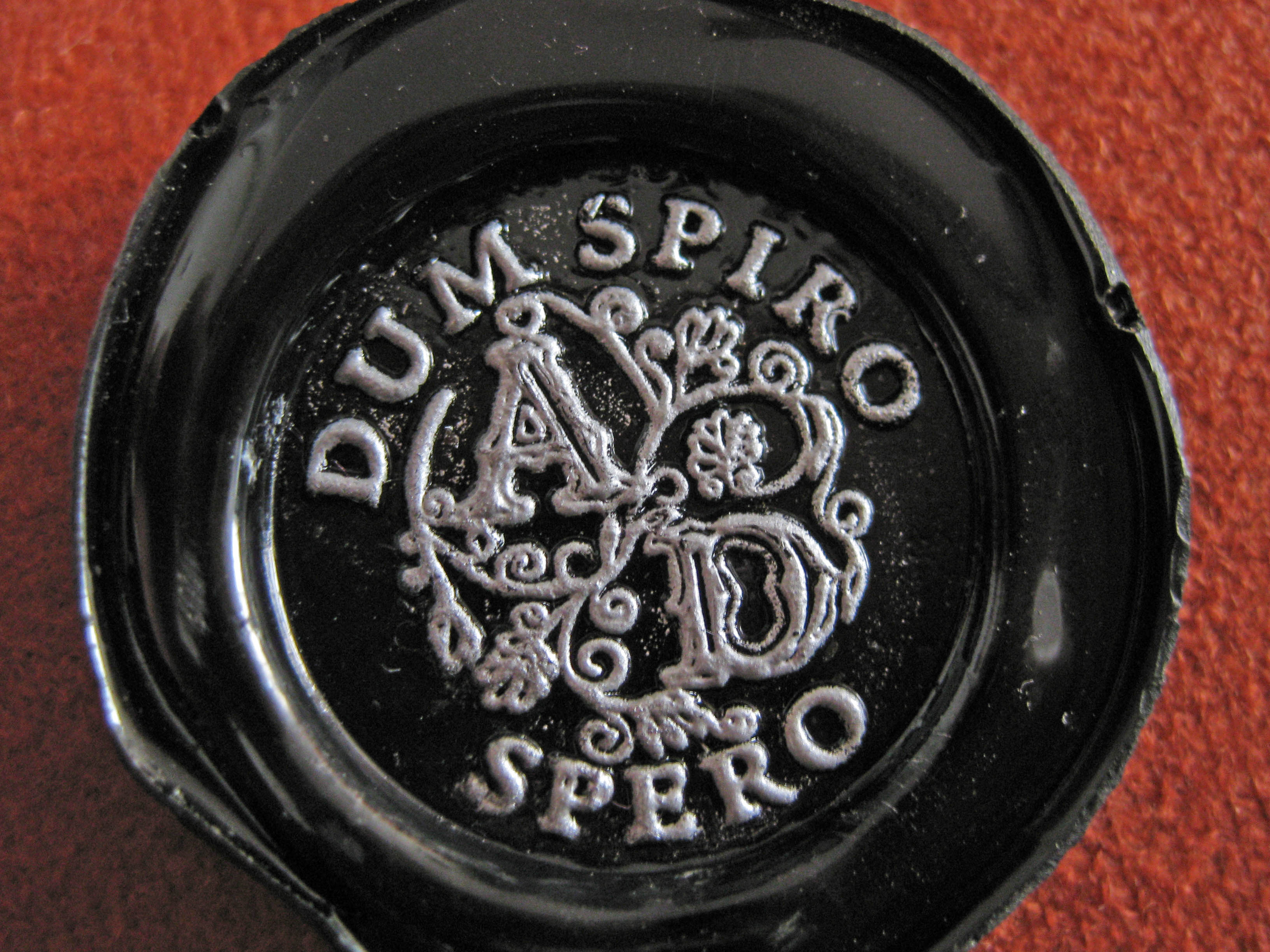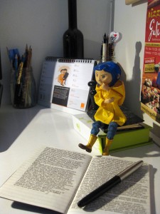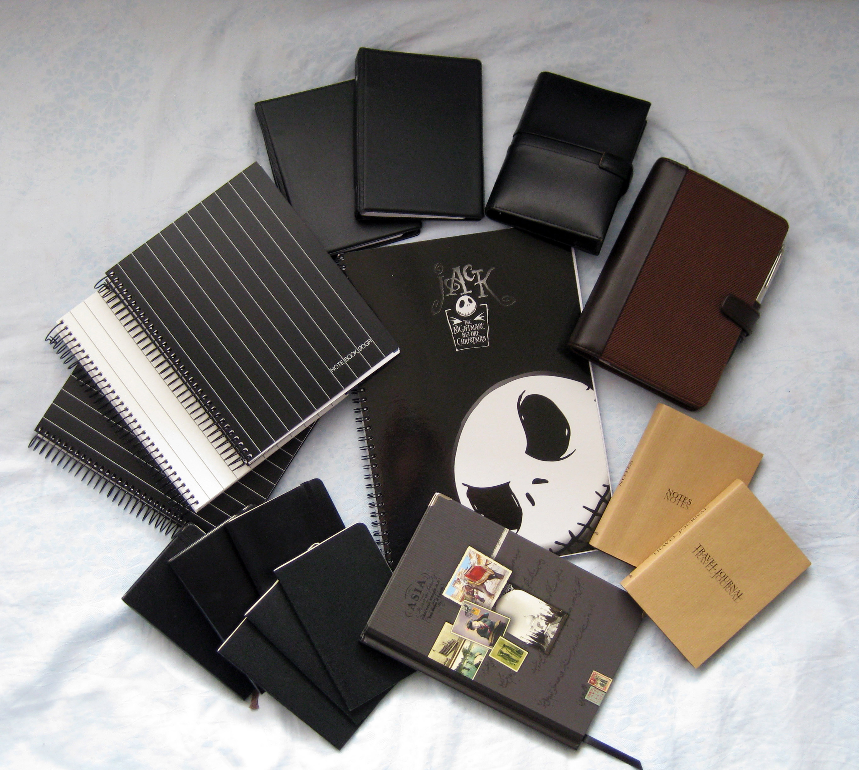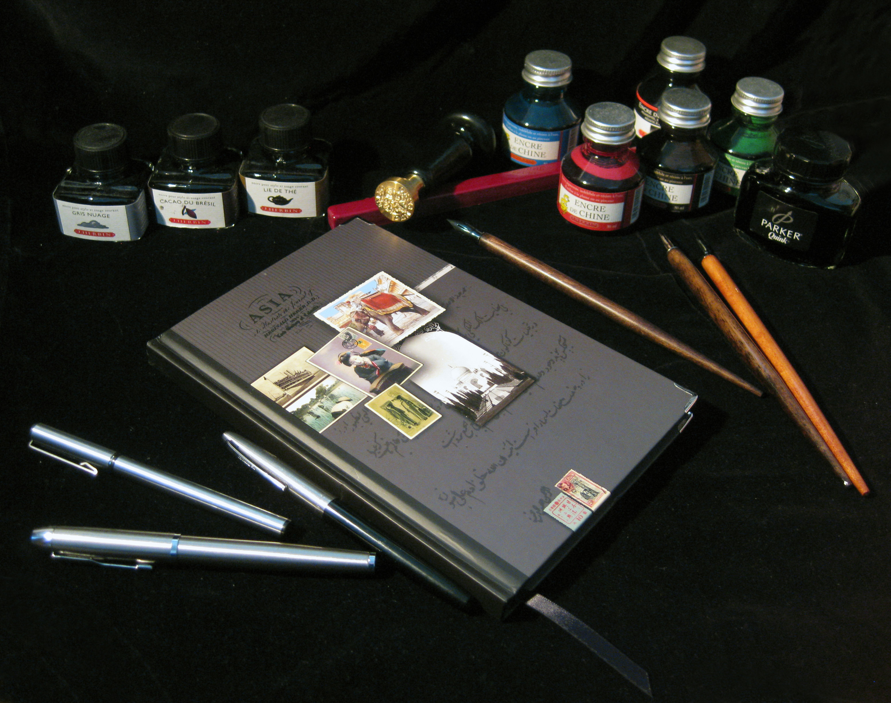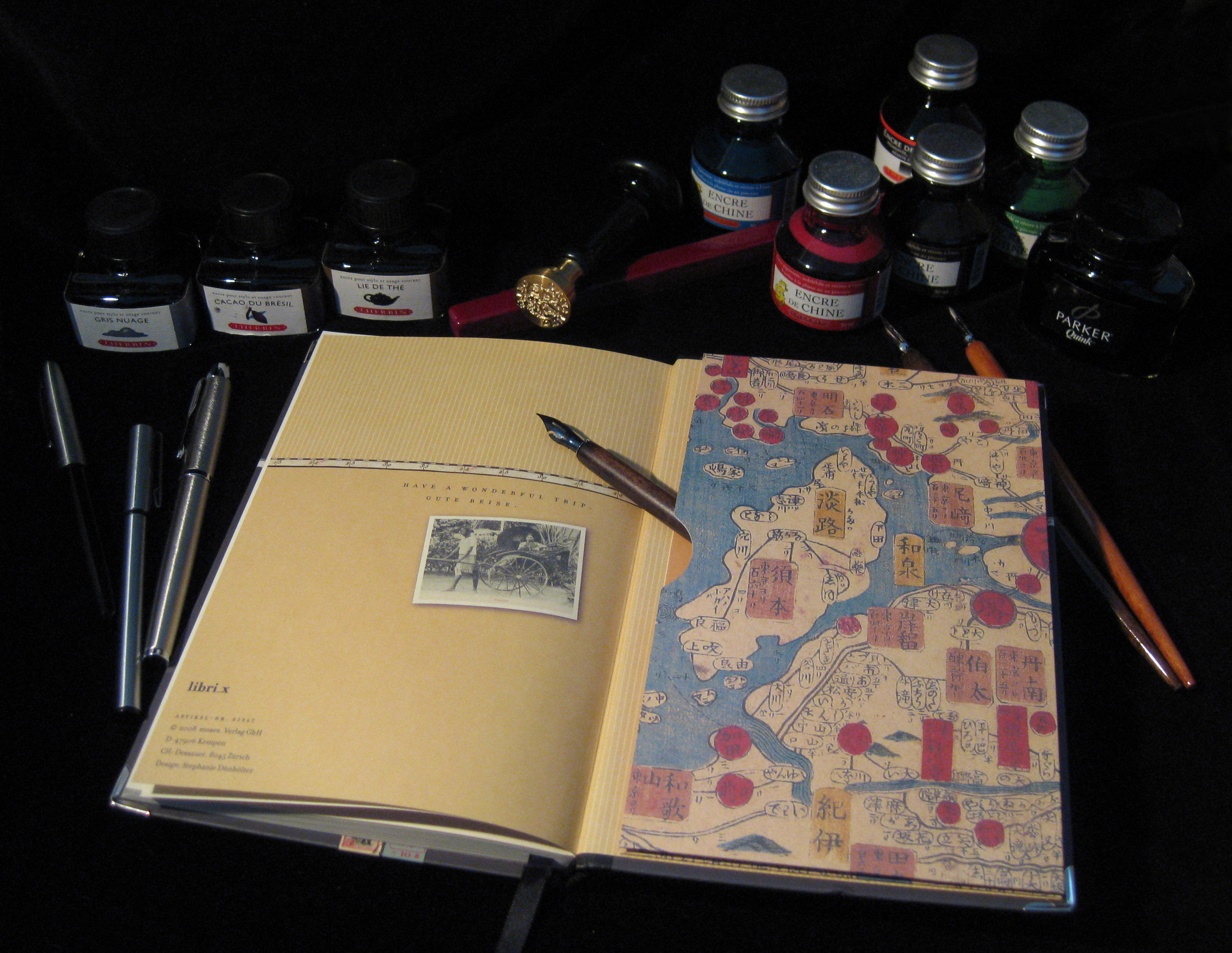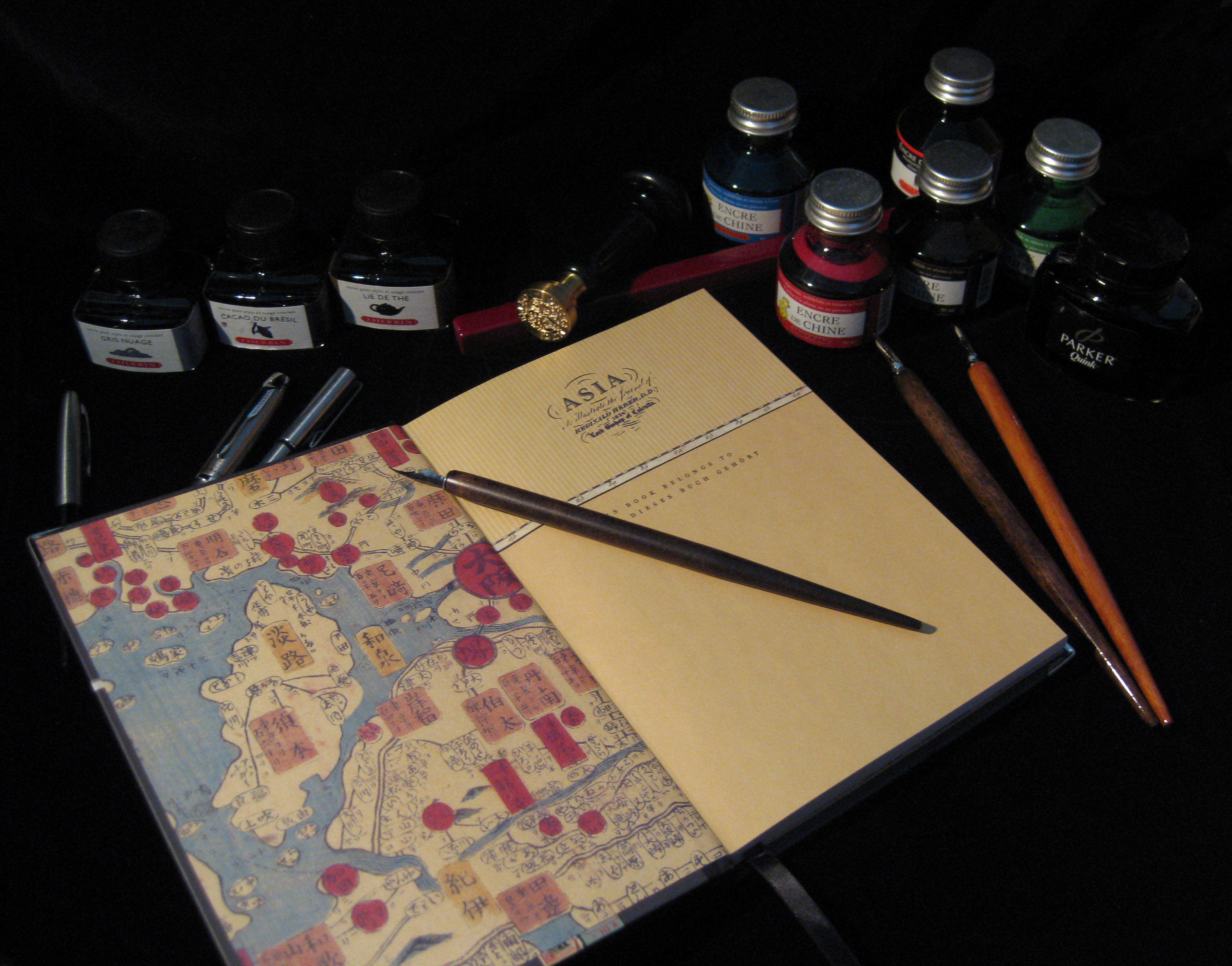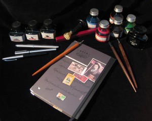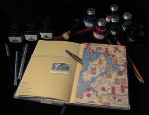 I am student of classical archaeology (hardly working on the dissertation thesis) and few months ago I found your website. I was so glad that I am not the only one, who is really “possessed”:) Please, take this as a big thanks for your work:)01 – This is my “almost black” collection with Moleskine, Miquelrius, Filofax and some notebooks without name. The A4-Nightmare Jack notebook I bought in Turkey and it is absolutely perfect:)02-03 Details of my recycled notebooks from Rome (purchased in Capitoline Museums). They are beautiful, but it took lot of time to find the right pen for writing in these – the paper is rough, so the fountain pens are bleeding and the ballpoints are almost invisible there; but Faber Castell Drafting and Sketching pen 0.1 is perfect for it.04 – My “working” notebooks. I am using them for notices about pottery, sketching the fragments. Except the pink one, all these are from Austria – “not-a-big-brand” perfect notebooks, very cheap and much more useful than Moleskine (I was so disappointed with the quality of lined journals: I cannot use my favourite fountain pens…). Those blue and orange notebooks are produced by company called Ursus (the bear) and they are extremely comfortable:)05-08 This is my most beautiful notebook Asia. Here you can see the front cover, inner design, back pocket and back cover. Together with my ink collection, pens, nibs and nib holders, and my personal sealer with one piece of sealing wax:) I am freak when it comes to things like these…09 I am sending you an example of my personal seal:) Hope you like it:)10 This is little greeting from me, my little Coraline and my present notebook:)