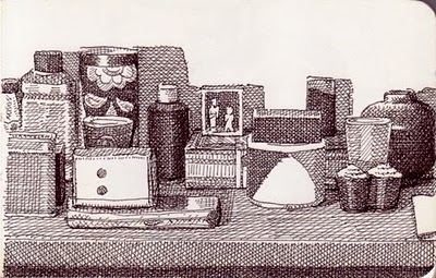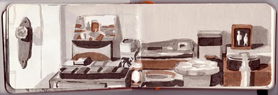 alla prima is the art blog of R Chunn of Portland, Oregon. (“Alla prima” is a term for a method of painting.) On Tuesdays, R posts sketchbook images like these, which seem to have been done in a HandBook Journal, from what I can see of the red edge and orange ribbon marker peeking out in one of the photos.