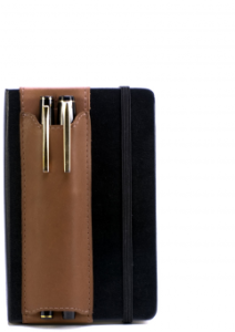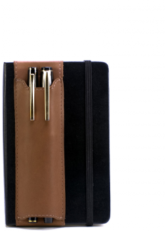 They come in black or brown leather, sized to fit large or pocket Moleskines. They should also work with Ecosystem or Piccadilly or other hardcover notebooks of the same size, or even a bit larger. Since they’ve designed the Quiver to attach with elastic, the pocket sized Quiver can accommodate notebook heights from 5.5†to 6.9†and the large size Quiver can accommodate notebook heights from 8†to 10.25â€.