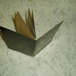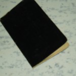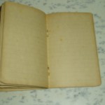 It is about 4 x 6 1/2″ with 48 lined pages which are edged in blue. The black, glossy cover has a feint, fine, vertical grooving with a hint of a random watermark pattern when the light hits it at the right angle. The cover feels as if it could be damp proof.There are no maker’s marks. The pages are held in place with a pair of staples that are rusting. No wonder I am into notebooks as I was born in 1938 !