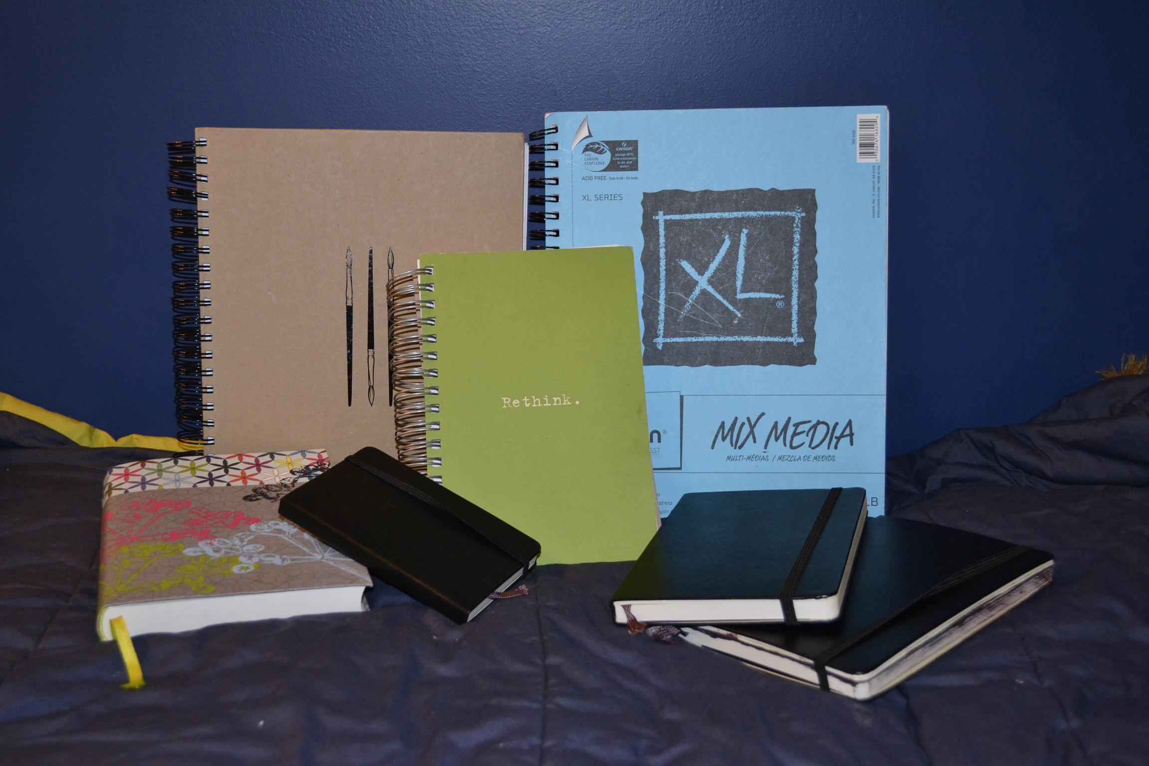 The photos I have show 32 of my absolute favorites, minus the drawers I have dedicated to course notebooks and other larger ones.The titles should be fairly exclamatory regarding what’s in each image.  In the sketchbooks, there are two graph paperchase that I got on clearance for about $3/each.  In the misc, there are three moleskines, two large and one of  my two pockets, all sketchbooks.  Missing is my blank moleskine notebook, and another moleskine sketchbook that I gave to a friend’s sister to encourage her to draw more.