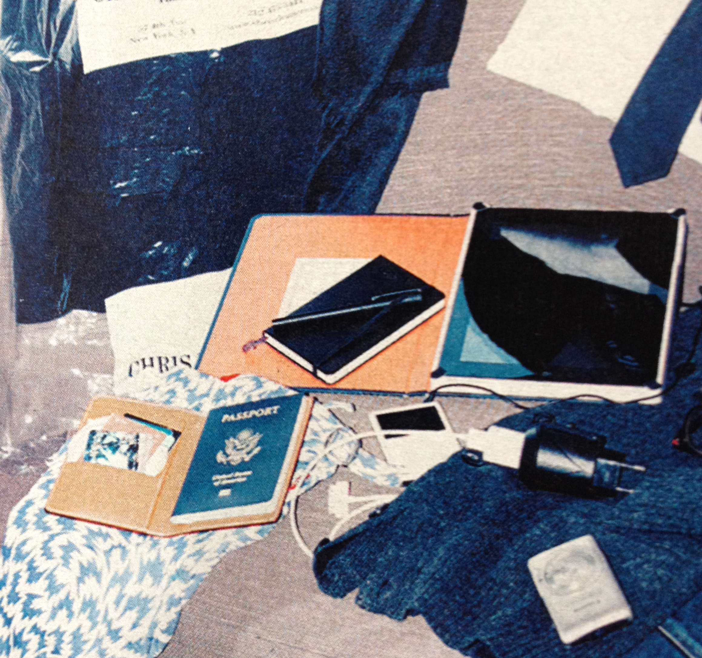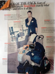 And a look at the efficient carry-on travel style of Bruce Pask (he’s the fashion director of the magazine). Can you spot the notebook?