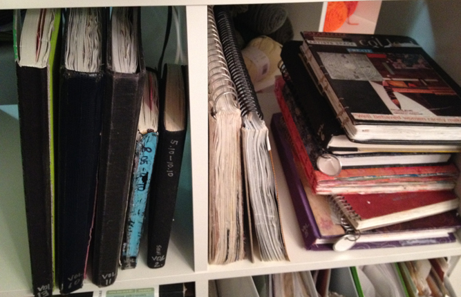 This week’s addict is an artist who makes very funky dolls and other decorative arts. She left a post on my Facebook wall, linking to this lovely shelf of well-used sketchbooks: