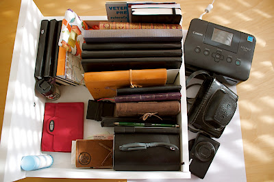 After coming back from Asia I decided to take picture of all my (current) journals and notebooks + few other things I use when writing and traveling.