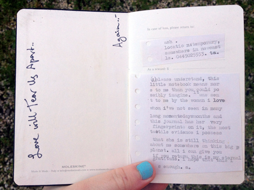 This is quite a poignant tale of a lost and found Moleskine. So far, the “if lost” contact number hasn’t helped, but given the heart-breaking plea below, I hope it finds its way back to its owner!