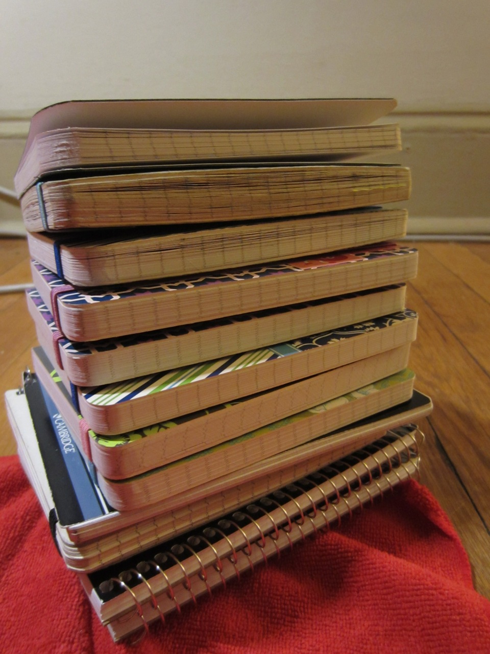 I love seeing them all piled up. I’m also intrigued by the contrast in this collection– a lot of addicts either have wild variety, with no two alike and lots of colors and patterns, and others use the same notebook type over and over, often plain covered ones. This collection is sort of half and half! Thanks for sharing your addiction, DreamerO!