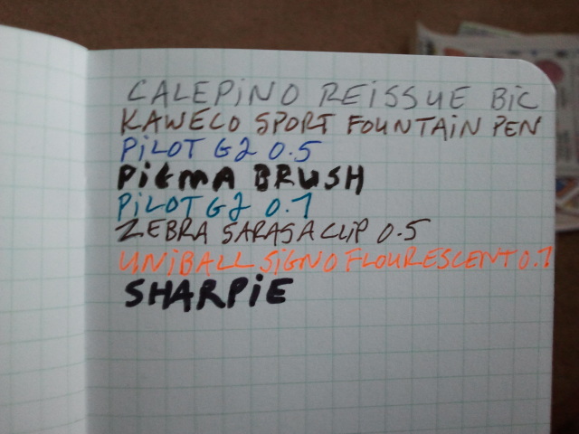 The Calepino paper feels less smooth to the touch than many others I’ve tried, but fine point pens still somehow glide over it quite comfortably. Fountain pens worked well. The grid lines slightly resist certain inks. I also found the bleedthrough and showthrough to be better than average.