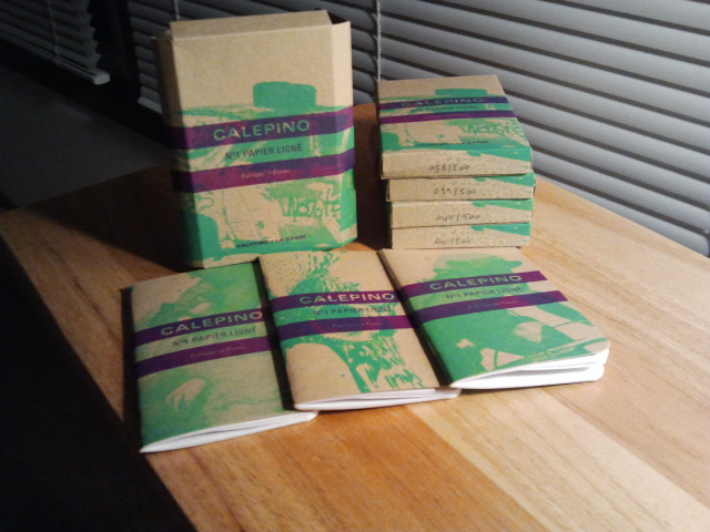 Got my Calepino Alteration Limited Edition. #’s 37-41/500 copies. Pretty swell. Thought you might like to see them. Cover appears to be sections of a painting/paintings? Doesn’t look familiar and doesn’t look like it fits together in any way. Dark Gray ruled pages which kind of sucks with such a colorful cover. Rulings occasionally off left to right on the pages if one writes across the crease. And I’ve noticed an ever so slight amount of smearing when using my regular graph so a couple seconds drying time. I got approx. 18 euro discount for ordering so much but can’t say at what point that kicked in. It was better than free shipping anyway which I was suppose to get. Fabrice apologized for that and sent a free pack of graph so I made out pretty well considering the exchange. I can say nothing bad about this company. Great product and service on the two purchases I’ve made. Even sent a quality heavy stock card thanking me and apologizing for the mix up and free pack. Hope the pics turned out. As I’ve said before, Field Notes, but their somewhat rougher around the edges French cousin. Or something.