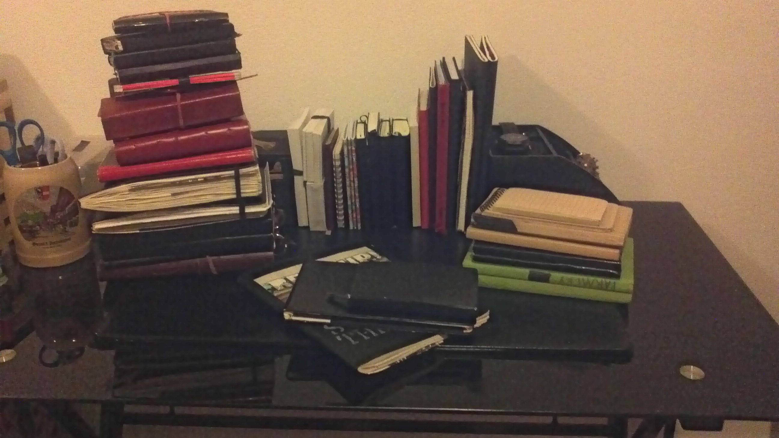The attached photo is of my notebook collection. Being in the military I take 2 or 3 pages of notes everyday. I carry a large rite in the rain. They are very durable in both design and paper quality. I have a moleskine in my cargo pocket and a Letts daily planner as well. Daily use at home and as I travel about Europe I have a moleskine in my pocket or at least within reach always. My favorite are the pocket size squared. The moleskine got this addiction started. I love your blog and check it daily.