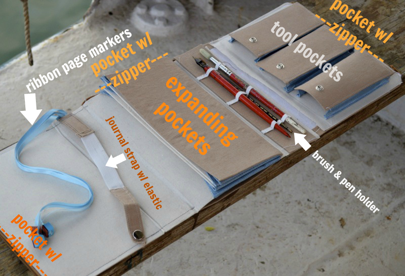 A really interesting look at someone’s custom designed travel journal holder, with a strap to fasten in the journal, plus pockets for favorite art supplies: