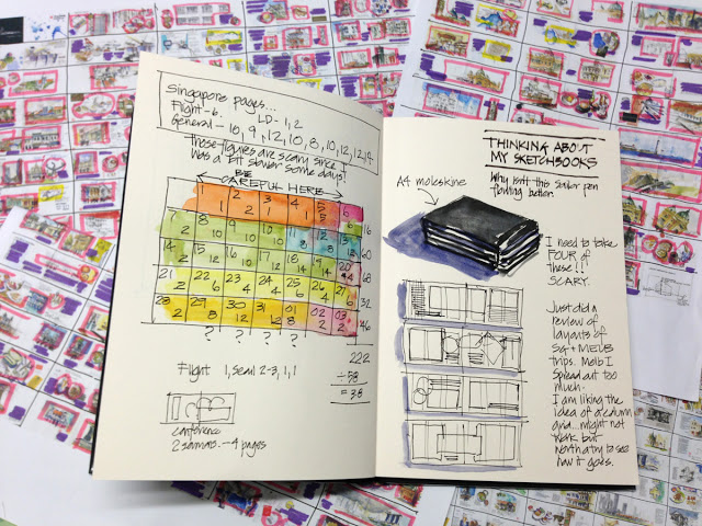 “I approach my sketchbooks like a graphic designer and the larger page size has more possibilities that I haven’t fully explored yet. I spent this evening’s cuppa analysing my layouts for both the SG trip and the Melbourne trip (marking up in different coloured pens the areas of text vs image vs maps. I feel the Melbourne sketchbook’s layout was a little ho hum so trying to work out what pages I like from the SG book….and what the feel I want for this years books.