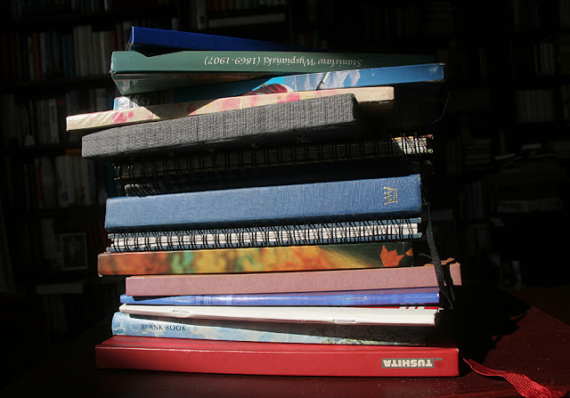 (the journals pictured are] just  the  filled  ones,  still need some preparation for the challenge  of making photos of the new and empty ones as well… there is a lot of them…)”
