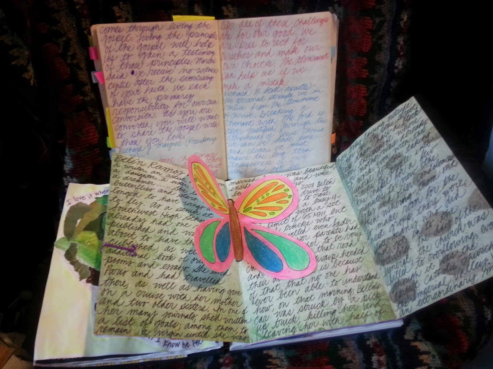 As a college student and, later, an adult, I have continued to write in journals. At this point, it is more like an addiction. Sometimes, I do not even really know what to say, only that I have a need to write. I also use my journals as sort-of scrapbooks. I have TONS of real scrapbooks, but my journals hold the smaller pieces of my life: ticket stubs from movies, fortunes from Chinese dinners, clippings from magazines I liked, post cards and letters sent from loved ones, and, most importantly, a LOT of glitter, sparkle, and bling. (I never met a shiny thing I didn’t like! lol!)