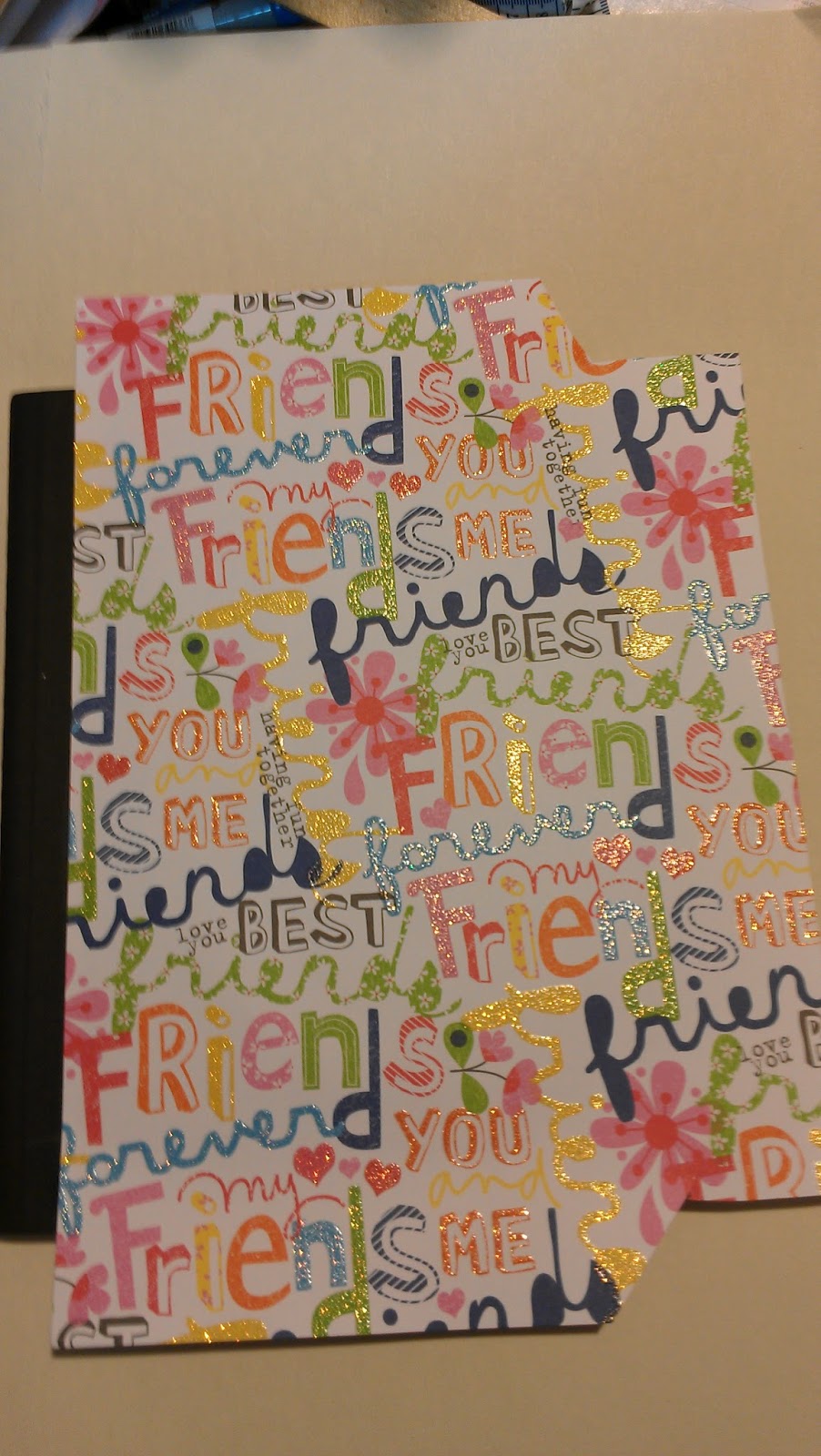 Step 7: Now, we will leave the flaps for a moment and work on the cover. Select a piece of paper that you would like to use to decorate the front cover of your book. Put glue all over the front cover, EXCEPT on the black fabric binding. Line your paper up against the binding, leaving some paper at the top and the bottom of the cover to fold over. Glue it on.