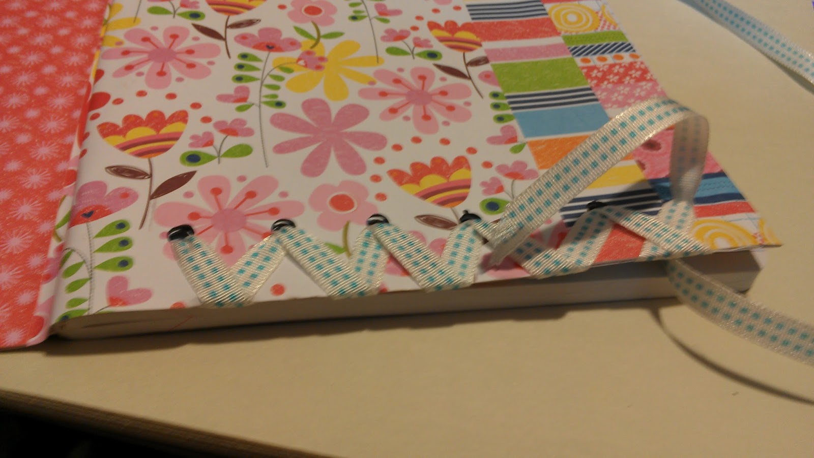 Step 21: Mark the same places on the top of the flaps and punch the holes so that you have matching holes in all three flaps, top and bottom. Then, get your narrow ribbon and start threading it through the first hole, closest to the edge of the pages. Thread it from the back to the front.