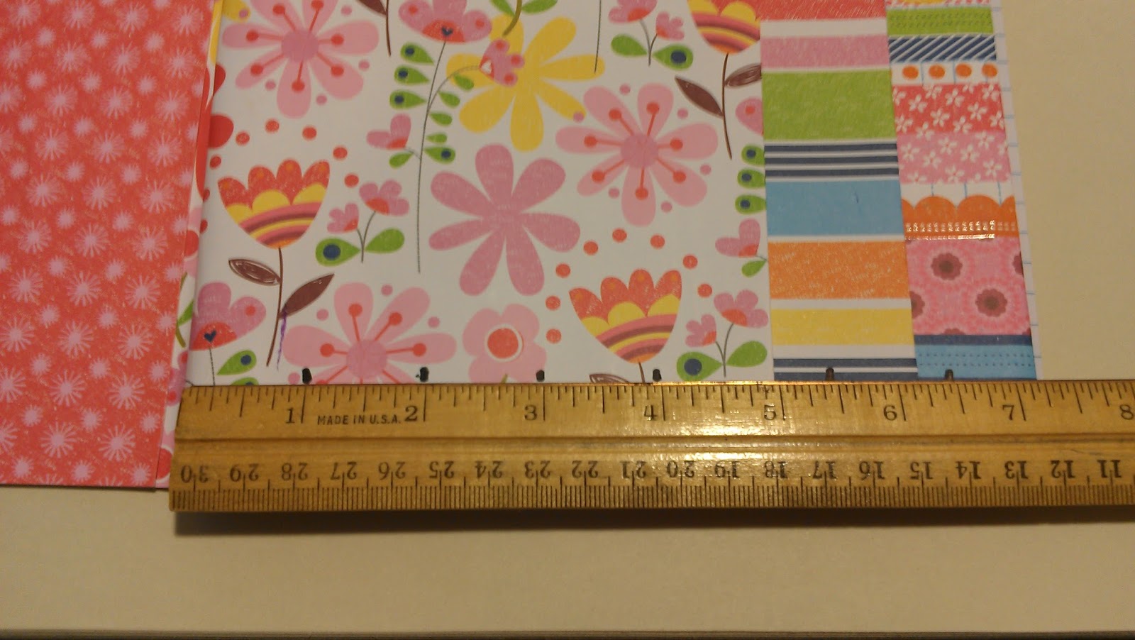 Step 18: Then, finish gluing the rest of that paper down. Now, we are going to take our three flaps and make pockets out of them. Line your ruler up at the bottom of flap one, so that the 5 inch mark is on the edge of flap one. Make a little dot at inches 1, 2, 3, 4, 5 1/2, and 6 1/2.