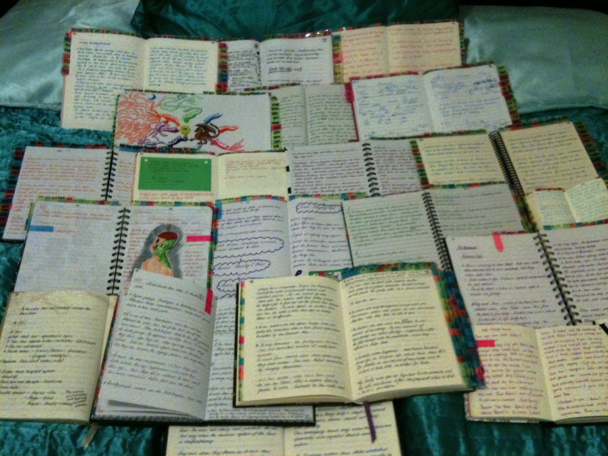 I like to be organised especially when it comes to my writing and my notebooks help me do this. I write down my ideas for stories or any piece of dialogue or description that comes into my head. It started as being a way to organise my thoughts, and take note of anything I would probably have forgotten later on. Now I have twenty one notebooks filled with ideas and the ideas are even colour coded by order of preference and divided so that the front contains story ideas, and the back has random snippets of dialogue, description, or research.