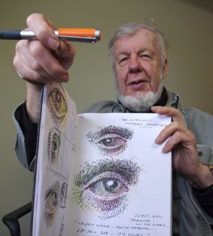 I take several pictures and then Forrestall leafs through the notebook to give me an idea of what it’s all about. Every page is filled with drawings, thoughts, notes, ideas. Everything from the eye studies to possible shapes of future paintings.