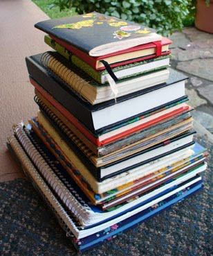 “I started to put photos on the front of my notebooks because I kept losing track of which one I was using. I would just pick up the closest pad, and the next thing I knew I had 7 different notebooks going. It was crazy. So I started to snip photos out of magazines and review copies of books, and glue them on the front.I guess I grew sort of fond of each notebook. You know, you carry them around all day and they become symbolic of certain stories. My hurricane Katrina notebook has a fire breathing monster on it. The notebook I used during a difficult week I spent as a host has a falling tree on it…”