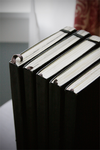 “I filled up the last page of my sketchbook/journal the other day and am looking forward to cracking open another fresh, new Moleskine notebook. I have been using these same journals for over five years now and get such a sense of accomplishment from seeing them all lined up on our bookshelf, knowing that between the simple, black, nondescript covers lie words, drawings, and mementos that detail some of my most precious memories and ideas….”