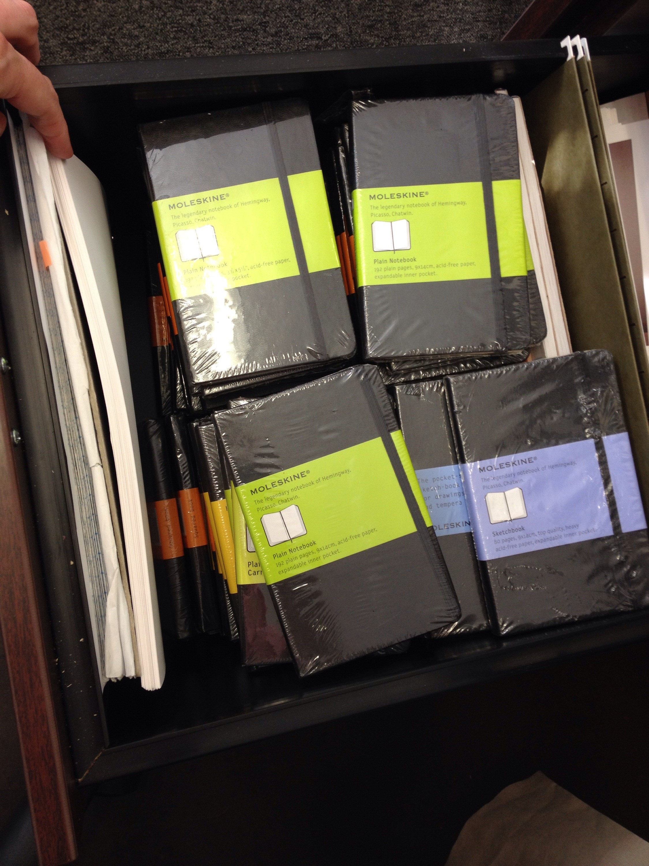Moleskine, My Collection, SketchbookMoleskine Monday: Office Stash August 3, 2015 Nifty Notebook 1 Comment Here’s the latest photo of the spare Moleskines I keep in my office… You know, for emergencies… There are more at home…