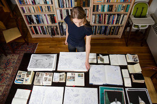 I love this image of the author/illustrator Lauren Redniss with some of the notebooks, sketchbooks and scrapbooks she used in the making of her book Thunder & Lightning: Weather Past, Present, Future.
