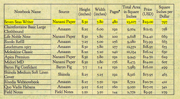 The other nice thing about Nanami Paper’s website is the thorough information they provide. I loved this comparison chart analyzing the value of popular notebook brands by how many square inches of writing space you get per dollar. It’s quite illuminating!