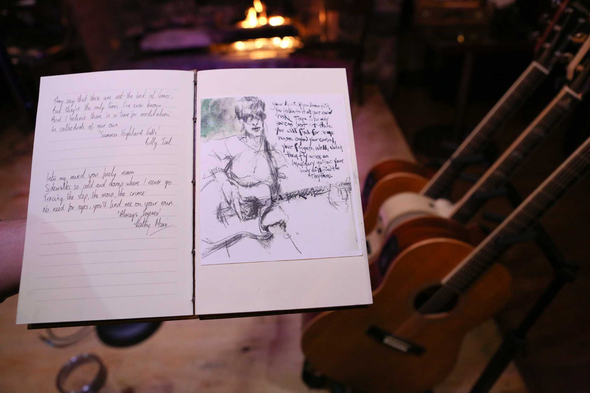 This sounds like great fun– a live music night at a bar, where a sketchbook makes the rounds so various artists can contribute drawings of each musician, with the that musician’s lyrics on the facing page.