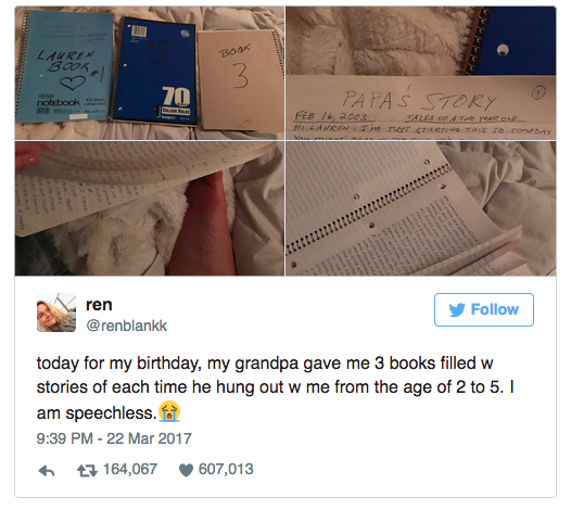 Her grandfather decided the time was right to share a special gift with her: three notebooks filled with her grandfather’s writing, documenting all the time they spent together from the time Blank was 2 until she was 5.