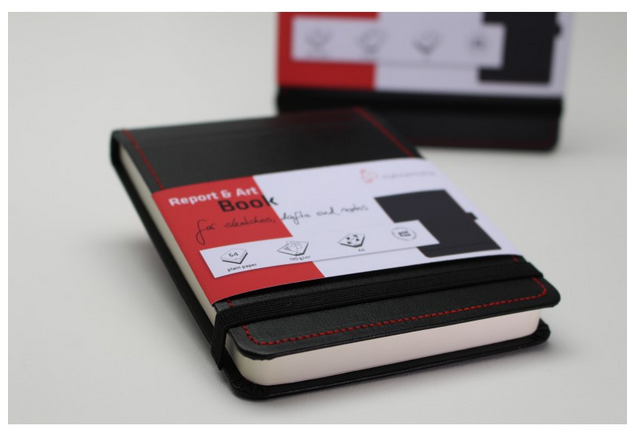 “Report and Art Book”– not so sure about the size or the cover overhang, but love that red stitching!