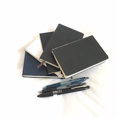 Moleskine Pocket Squared– I almost always have one of these going as my daily journal, log-book and catchall. I record what I’ve eaten, my exercise and other health notes in this notebook, as well as my current to-do lists, divided into various subjects. I write journal entries here, and occasionally do a quick sketch and paste in clippings of images that appeal to me. This notebook is always with me.