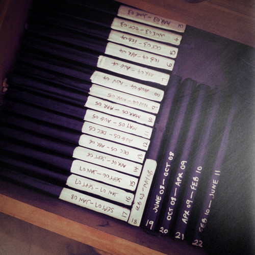 These are my journals dated 2003 – 2011. All large ruled Moleskines. They are the first things I would try to save if my house was on fire. I also use Moleskines for book notes and other writing projects; the Filofaxes are for biz project organisation, diary, addresses and admin.