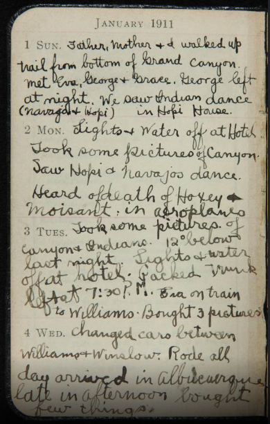 Henry Ford and his family spent the beginning of January, 1911 visiting the Grand Canyon. Edsel noted in his diary that on New Year’s Day he joined his parents on a hike in the canyon. Other activities included visiting with Clara’s sister Eva and her husband, watching Native American dances in the Hopi House and photographing the canyon.