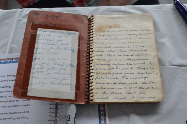 McDonald’s hand-written message would eventually be secured and packed away to Washington, D.C. But not before Schimmel copied it word-for-word in a spiral-bound notebook. Schimmel showed us the yellowed notebook, with the date “December 7, 1941†clearly visible in blue fountain ink. Also clearly visible were the words, “a great number of planes coming in from the north.â€