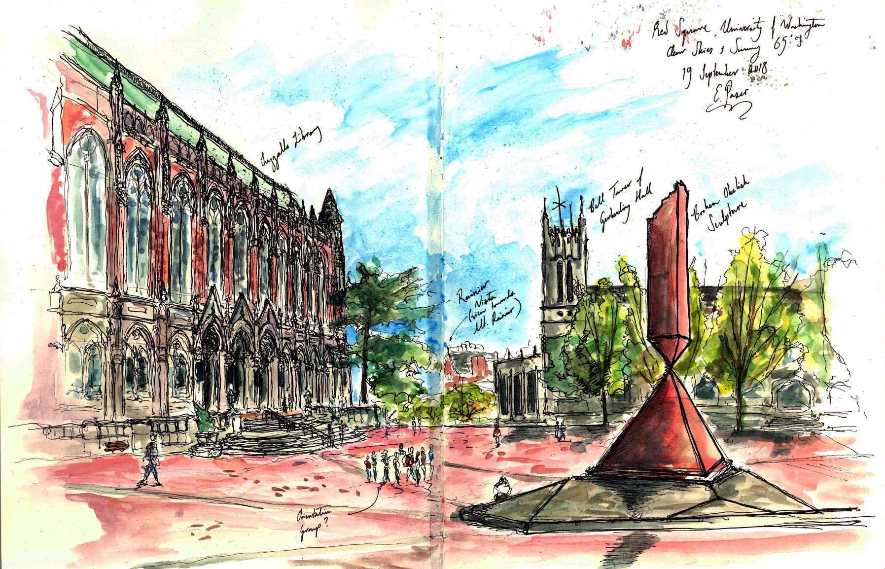 Nice to see an urban sketcher documenting life at the University of Washington. Eli Pasco has a regular feature on the campus newspaper’s website: