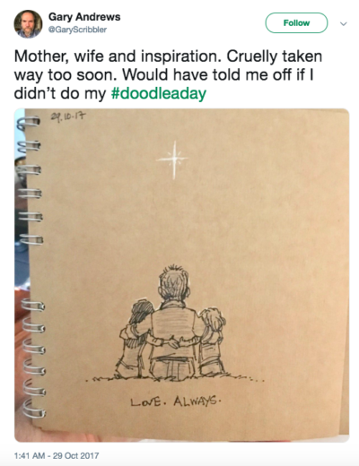 On his 54th birthday, TV animation director Gary Andrews started a Doodle Diary. This still-ongoing project is simple, but it has proved powerful over the past year; he chronicles his day in a sketch. When he first began the endeavor, Andrews often depicted his life as a happily married man, enjoying the world with his wife Joy and their two young kids. But now, it’s a different story. Joy suddenly passed away on October 27, 2017, from multi-organ failure caused by sepsis. Andrews was on a business trip at the time and was unable to say goodbye to his wife before she died.