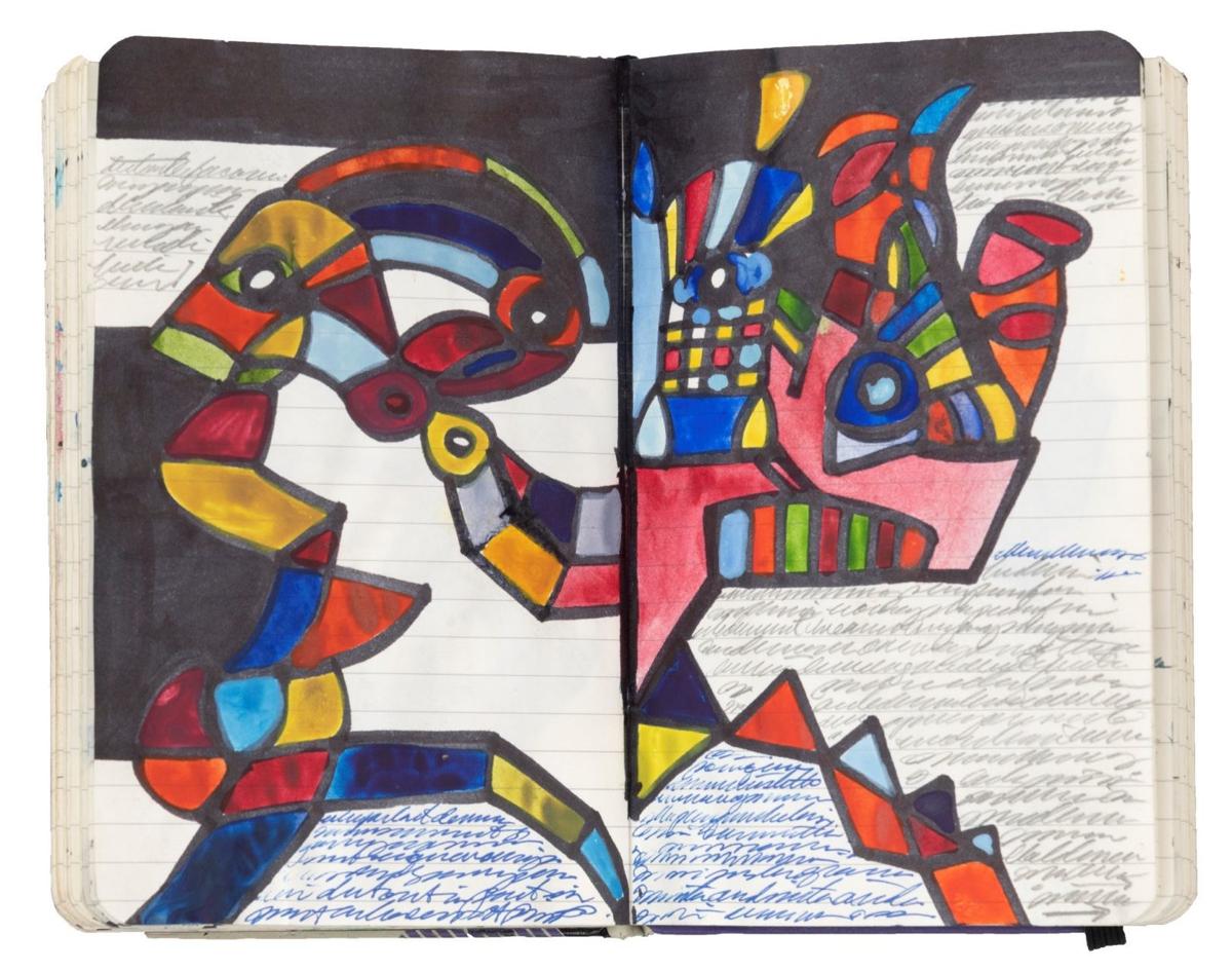 The artist, writer and curator Phillip March Jones almost always carries a notebook — a small Moleskine affair, just the right size to put in a jacket or pocket, suitable for jotting down important notes.Typically, he also travels with art supplies (he is an artist, after all), and so 15 years ago, he started to develop meandering compositions that build, with color and form, on the scribblings in each notebook, phone numbers, names and so forth.